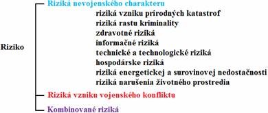 Riziko v nás vzbudzuje pocit kontroly a ovládania neznámeho. Prevracia subjektívnu neistotu v objektívnej pravdepodobnosti, v ovládaní procesov. Riziko chápeme ako abstraktnú veličinu s pravdepodobnosťou odvodenej od hrozby. Jedná sa o možnosť vzniku udalosti s výsledkom odchýlnym od predpokladaného cieľa s určitou štatistickou nádejou. Hovoríme o kvantifikovanej neistote. Riziká sa delia na riziká nevojenského charakteru, vojenského konfliktu a kombinované riziká.
