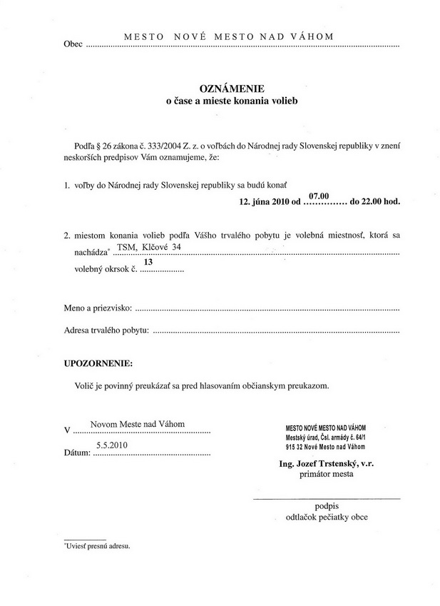 Oznámenie o mieste a čase konania volieb